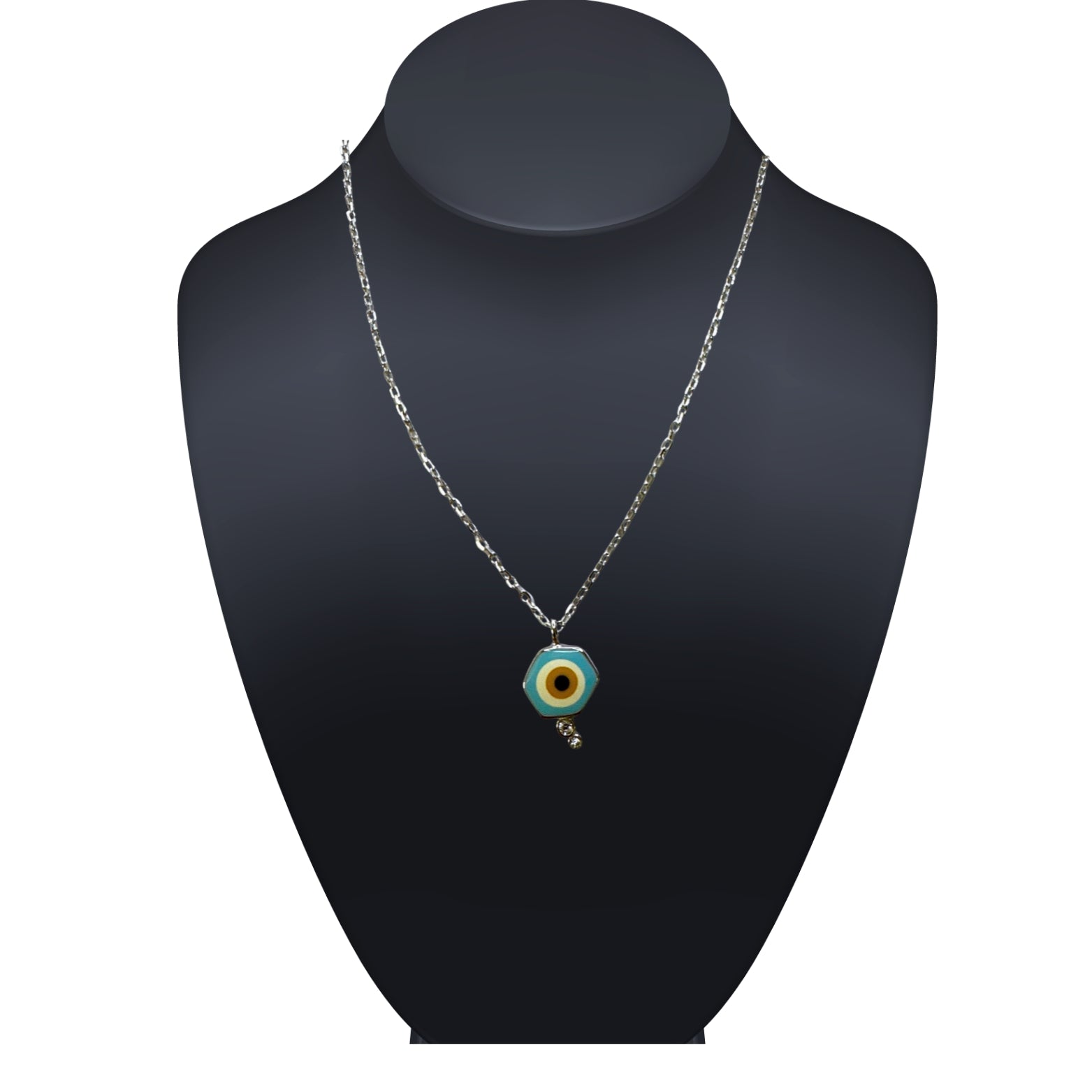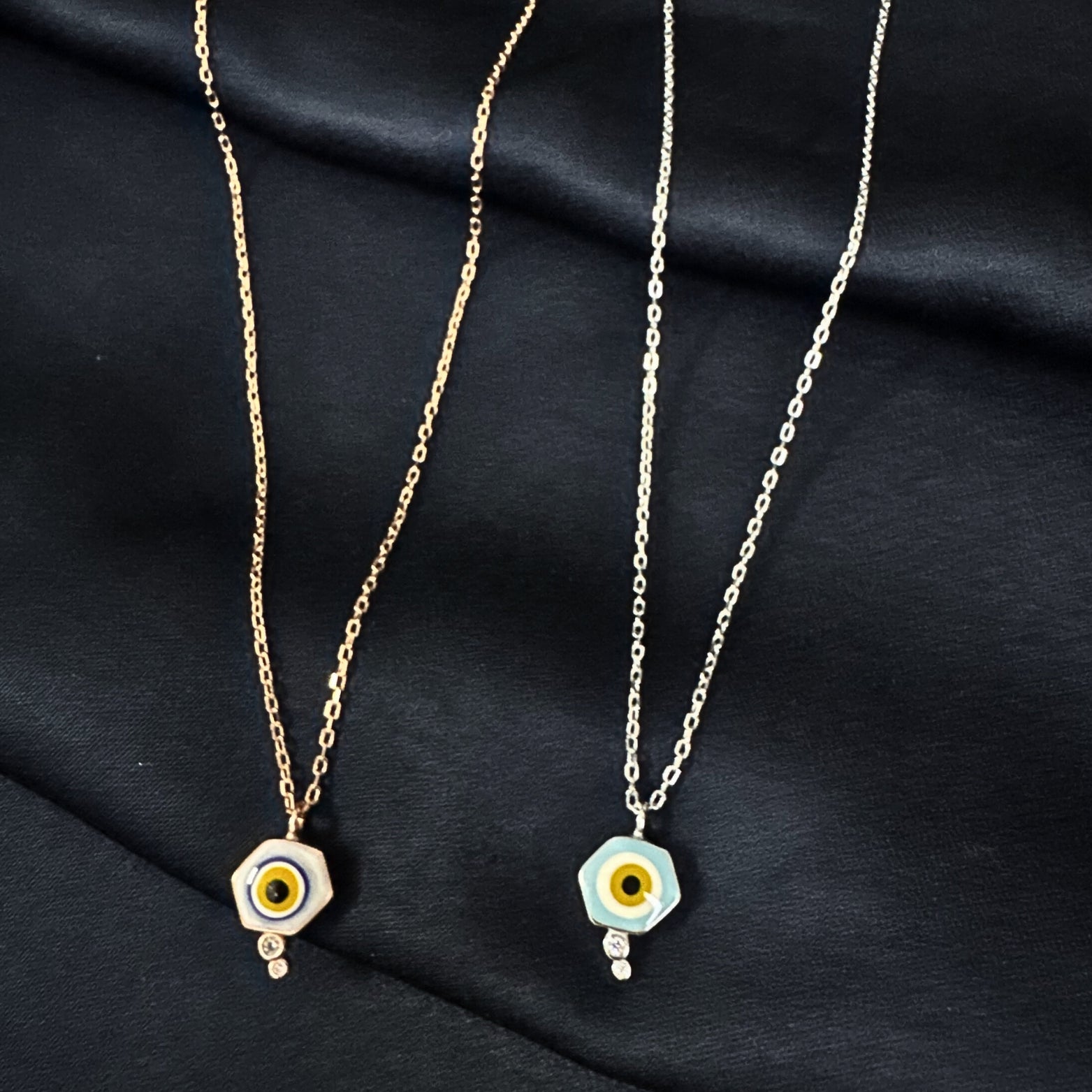 Embrace protection with purpose in our stunning hexagonal protective eye necklaces. Each piece features a distinctive geometric design that modernizes this ancient talisman, combining traditional blue and gold eye symbolism with contemporary elegance.
